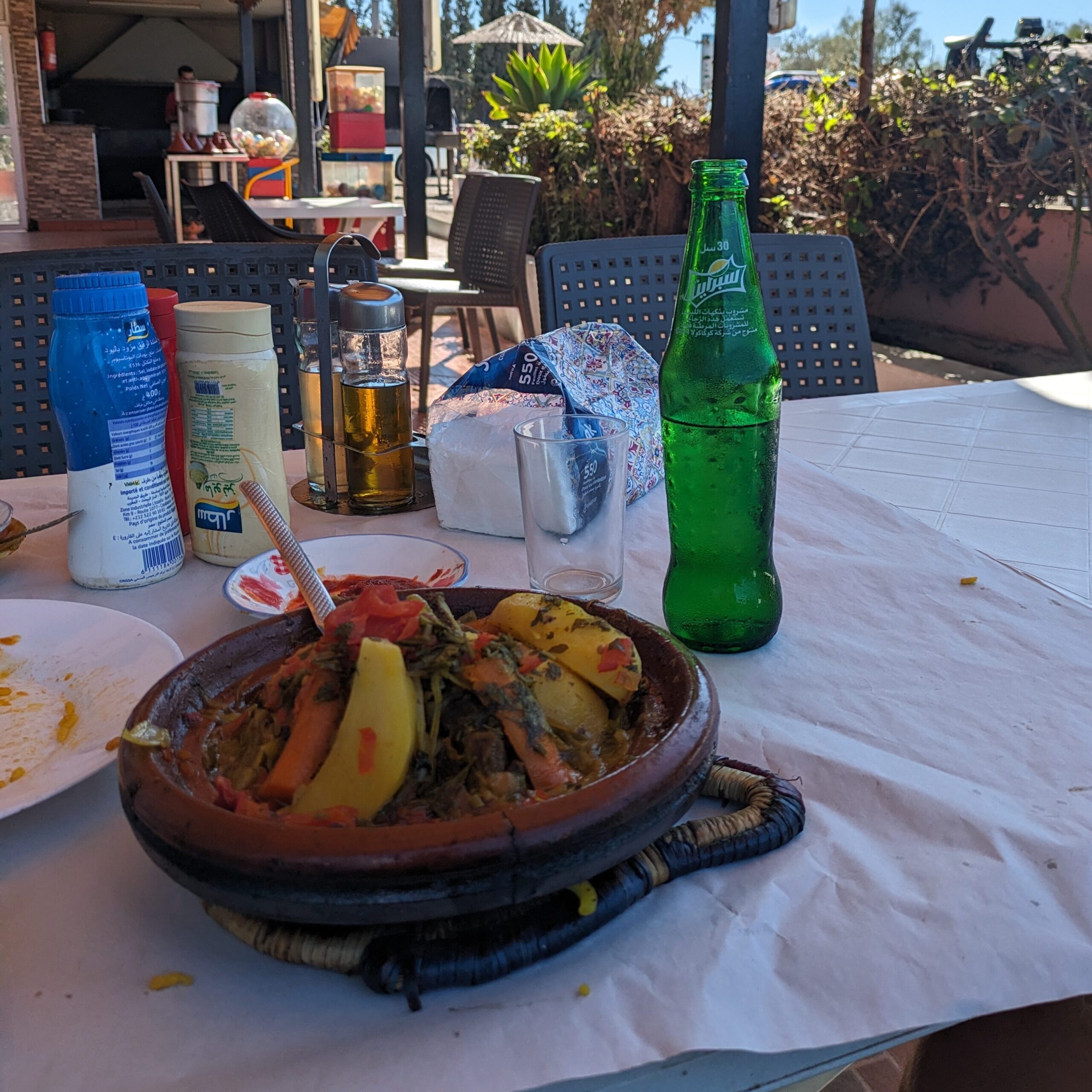 Despite the crazy wind and busy roads, once I had cycled beyond the suburbs and had space to breathe, I found myself whooping out loud as the mixture of glee, adrenaline and excitement of the new country and the next big step on the adventure started to sink in. Stopping for a late lunch at a roadside restaurant, I tucked into my first ever tajine. Wow. What a delicious treat for a very hungry boy.