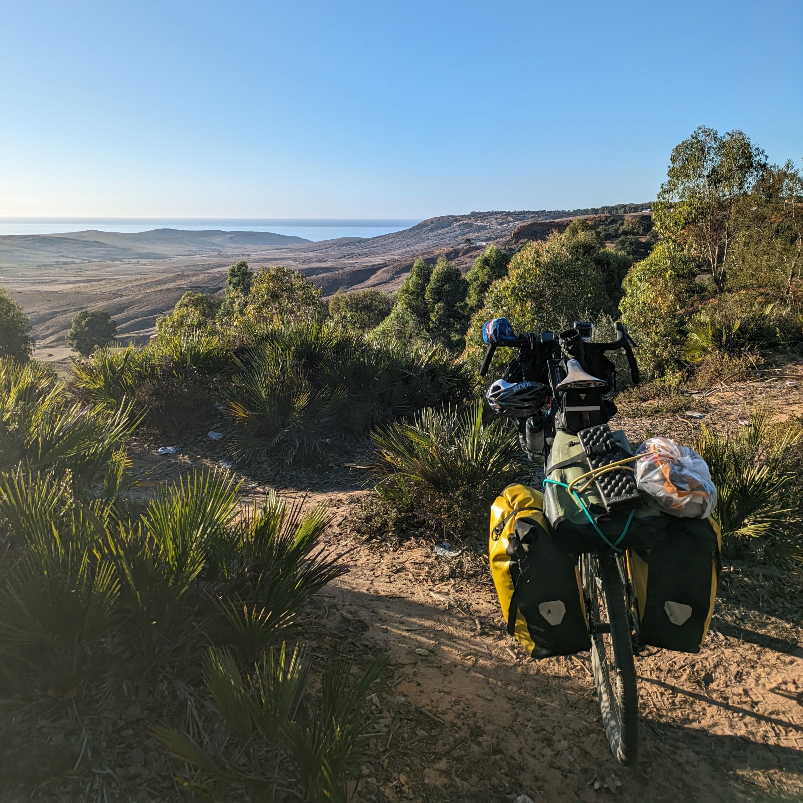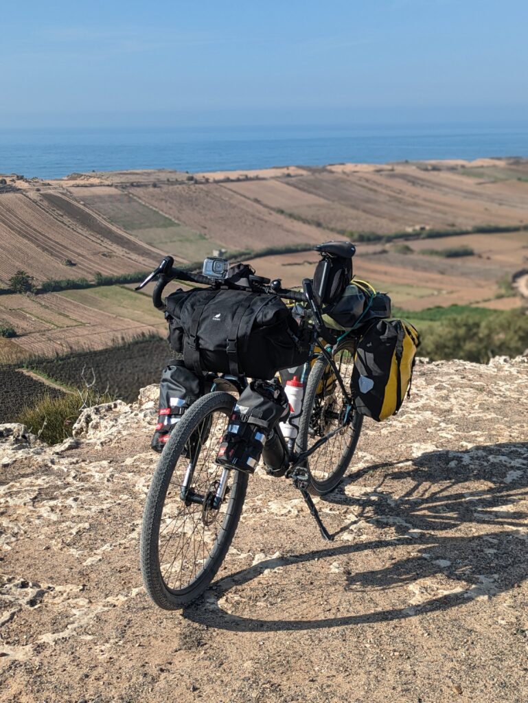 With one last big day in the saddle before a planned rest day in Essouria, I gingerly continued onwards with a plastic screw from a bottle cage temporarily holding the rack in place, painfully aware that the best part of 20kg of luggage was being held in place by a single flimsy piece of plastic. It would prove to be one of the toughest days of the journey so far, with plenty of climbing up coastal cliffs under a beating sun with almost no shade or food stalls to stop and refuel.