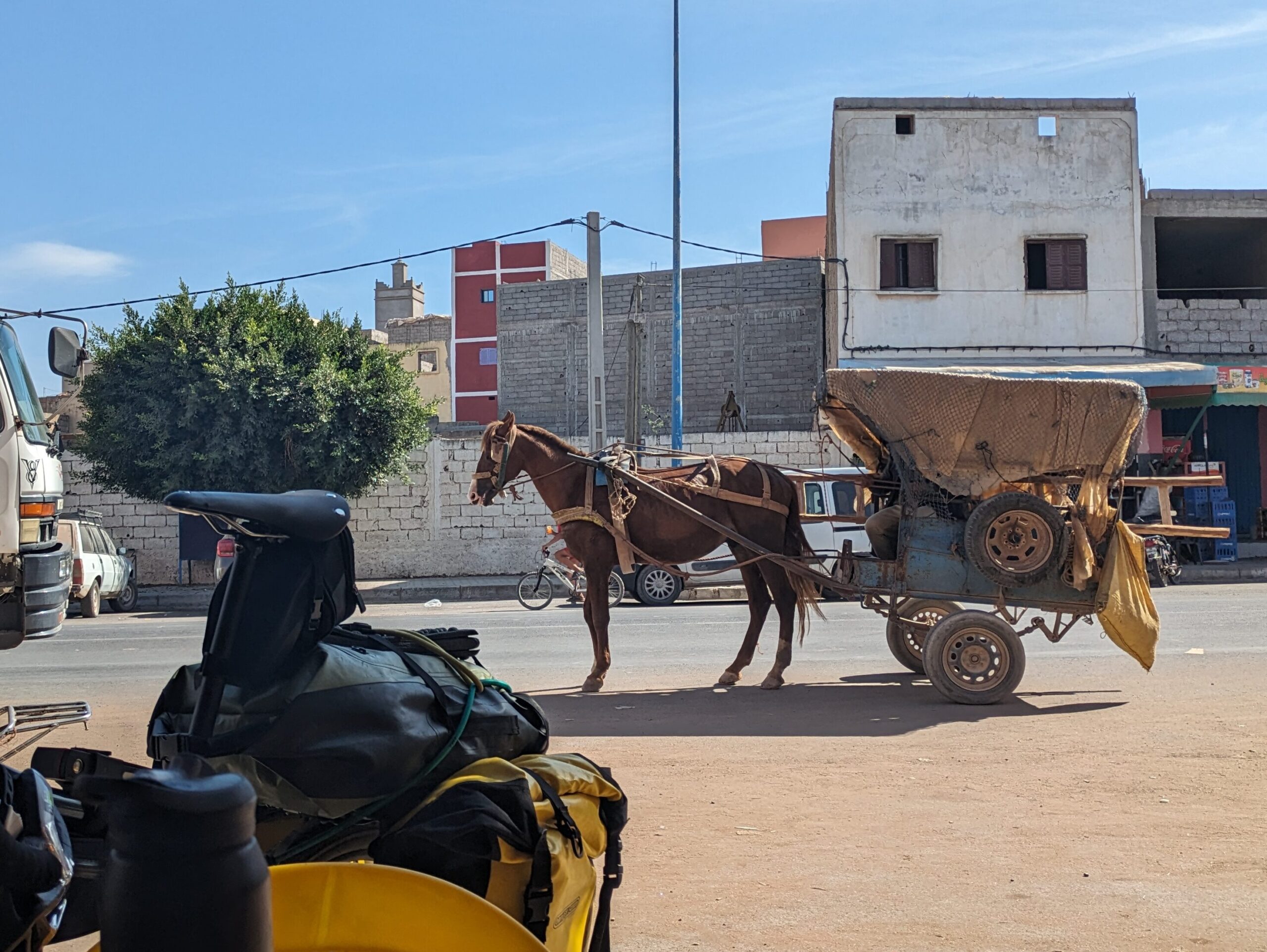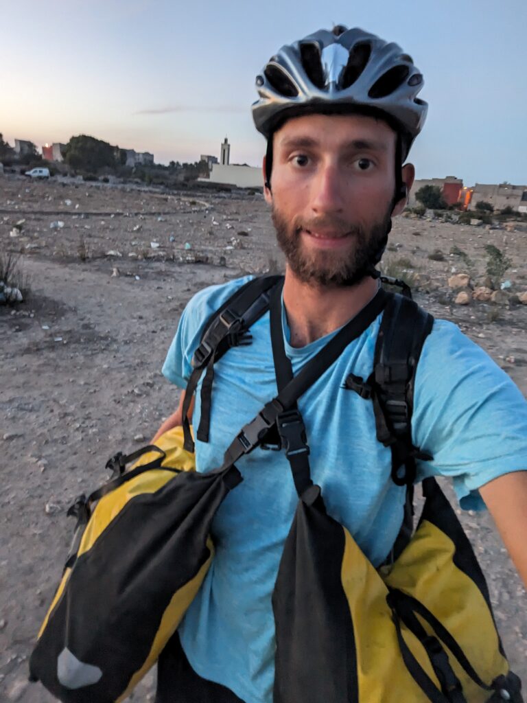 Canine-based incidents aside, it was exciting to feel like I was reaching the edges of the Sahara. Rugged ground began to merge into large stretches of sand dunes. As the sun set and I neared my Airbnb, I had my first serious mechanical of the trip – I felt something was very wrong with the cassette on the back wheel, with scraping noises and a sudden resistance. Removing my bags to inspect the damage, to my horror I noticed that the rack carrying my 2 large panniers and rucksack had come out of its mount on one right and was scraping along the cassette. While in reality this was a relatively minor mechanical issue, with my complete lack of bike knowledge and inexperience in finding temporary solutions, it felt potentially catastrophic. After a fruitless search for the missing bolt as darkness approached, I had to improvise, and ended up pedalling the last couple of kilometres with my backpack on and panniers hoisted over both shoulders.