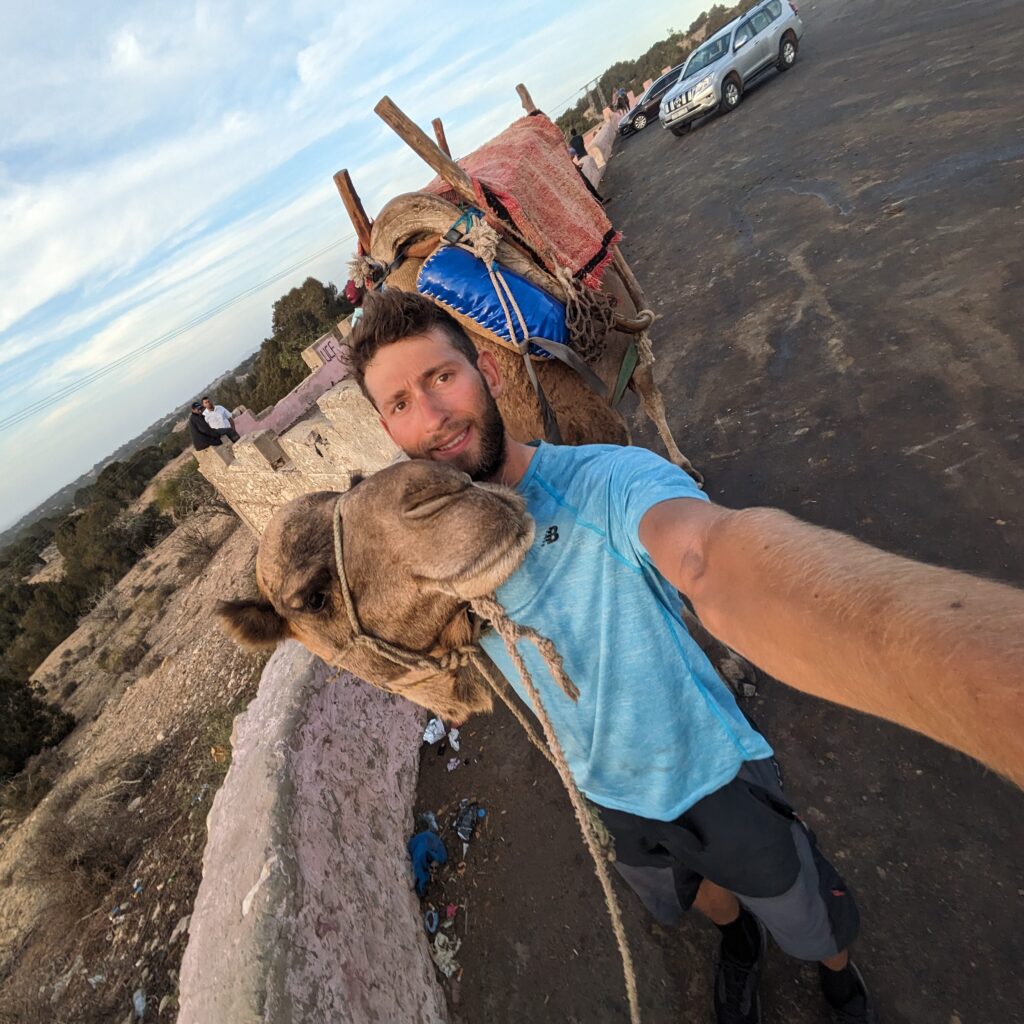 Hoping to find a cafe as I left my Airbnb for some pre-ride fuel, I instead found myself cycling 30km through the middle of another huge oil refinery, lungs cooked by the fumes. Around 12:30 I finally found a tiny village by the sea, and devoured small loaves of bread stuffed with chicken and chips, washing it down with tiny glasses of very sugary tea while sheep, goats and camels wandered past. Regaining my strength, it felt so refreshing to be away from the busy cities and half-built suburbs. Stopping just once more for a mid-afternoon tajine, I powered through the final 70km of the day with almost no break, only stopping a few kilometers outside of Essouria as the evening approached to enjoy a coffee with a view over the city. I was approached by a young guy who introduced himself as Mohammed, and asked if I wanted to take a picture with his camel, Jesus Christ. Jesus Christ was an absolute darling, and I obviously obliged.