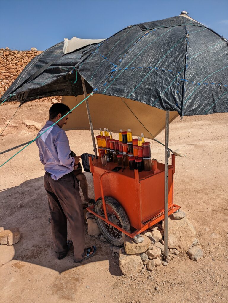 Feeling rejuvenated the next morning, I continued on South into the Anti-Atlas mountains, the Sahara almost upon me. It felt like a cheat code cycling without the illness or headwinds of the previous days, and I was enjoying being back in the saddle. As I continued into the hills, I paused to investigate an unusual roadside stall covered by a makeshift tarp canopy. Before I knew it, a smiling man in a purple shirt and maroon trousers had convinced me to buy a small pot of overpriced honey. What I didn’t realise at the time was that it was only sealed by a flimsy piece of sellotape, and when I arrived in my riad in Tiznit for the night, I was horrified to open my pannier to find my tent and clothes covered in sticky honey and sand. Nightmare.