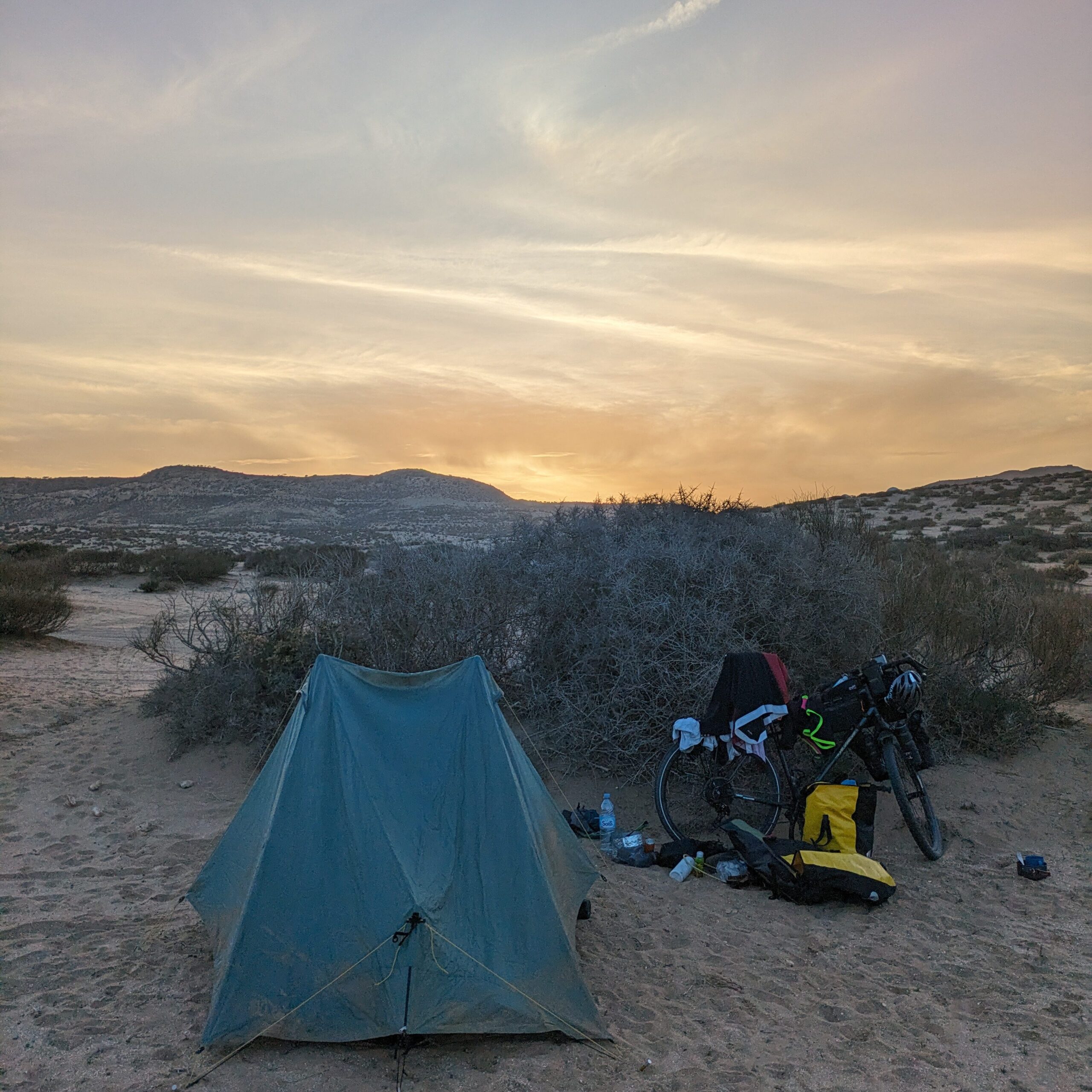 The remains of my dinner had seemingly attracted every bug in the surrounding area, and I could barely sleep with so many new companions crawling around. Giving in at around 2am, I put up my tent to escape my new campmates. While I was able to sleep until dawn, I paid the price of getting my belongings full of sand when I packed up my panniers the next morning.